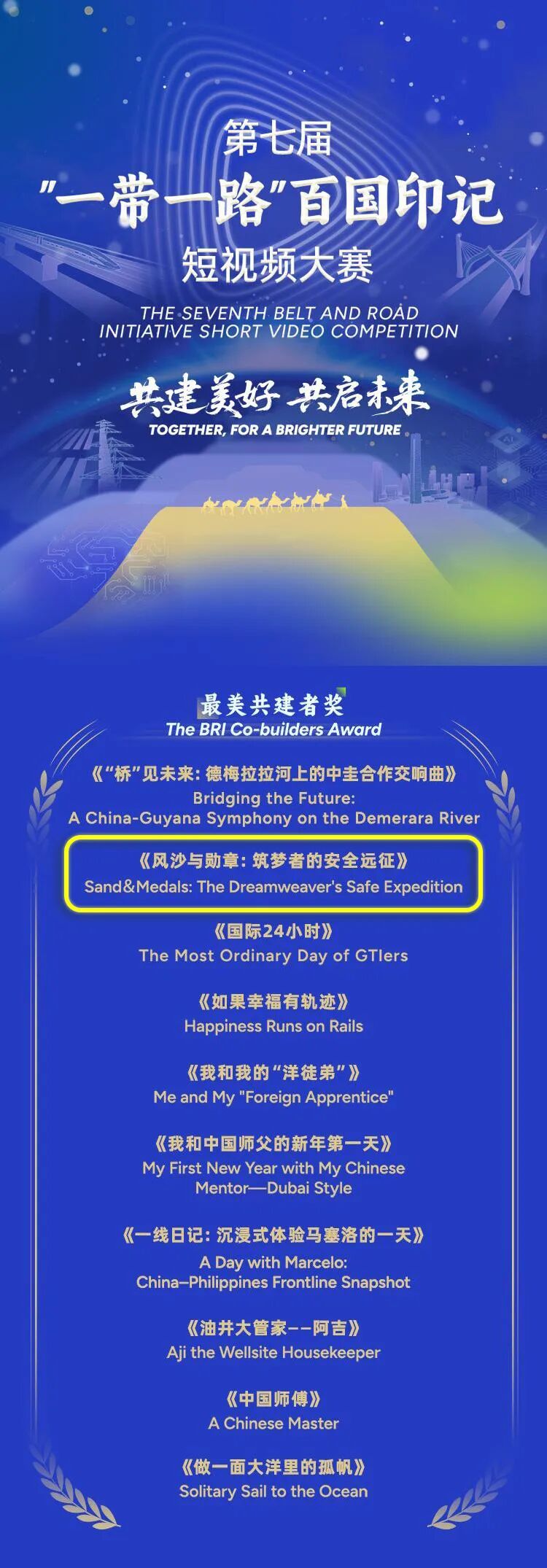 日前,由中國公共外交協(xié)會、環(huán)球網(wǎng)聯(lián)合主辦,國務(wù)院國資委新聞中心、中國駐柬埔寨王國大使館、柬埔寨王國駐華大使館、中國駐南非共和國大使館、中國駐保加利亞共和國大使館、中國駐塞爾維亞共和國大使館支持的第七屆“一帶一路”百國印記短視頻大賽落下帷幕,大賽以“共建美好,共啟未來”為主題,吸引了來自全球130余個國家和地區(qū)的近2000部作品參賽。經(jīng)過激烈角逐,共有161部作品脫穎而出,哈電集團短視頻作品《風沙與勛章:筑夢者的安全遠征》榮獲“最美共建者”獎。
