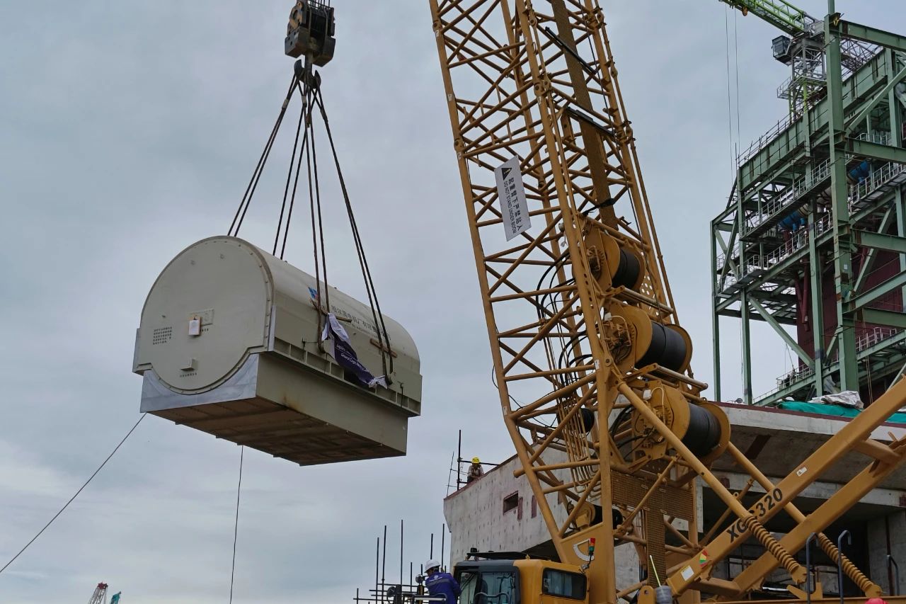 達(dá)來甘項(xiàng)目汽輪發(fā)電機(jī)由電機(jī)公司生產(chǎn),定子長5.803m、寬4.16m、高3.743m,運(yùn)輸重量達(dá)141t,是達(dá)來甘項(xiàng)目最重的單體設(shè)備。為確保吊裝任務(wù)安全順利完成,達(dá)來甘項(xiàng)目團(tuán)隊(duì)在吊裝前組織設(shè)備廠家、施工單位對吊裝工序中的每一處細(xì)節(jié)進(jìn)行反復(fù)論證、推演,不斷優(yōu)化吊裝方案,監(jiān)督施工單位做好吊裝前安全、技術(shù)交底。吊裝過程中,各專業(yè)分工明確、配合緊密,技術(shù)人員、安全人員全程監(jiān)護(hù),作業(yè)人員嚴(yán)格執(zhí)行吊裝方案,落實(shí)各項(xiàng)安全技術(shù)措施。整個(gè)吊裝過程指揮有序、操作流暢、安全平穩(wěn),吊裝作業(yè)圓滿完成。