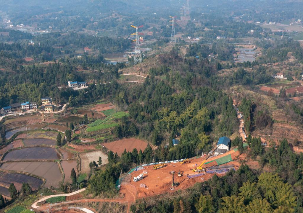 川渝1000千伏特高壓交流工程施工現(xiàn)場(chǎng),一片繁忙景象(無人機(jī)照片)。新華社記者劉潺 攝