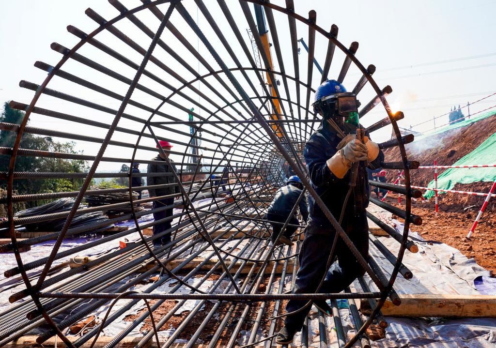 在重慶市潼南區(qū)小渡鎮(zhèn)川渝1000千伏特高壓交流工程施工現(xiàn)場(chǎng),工人進(jìn)行焊接作業(yè)。新華社記者劉潺 攝