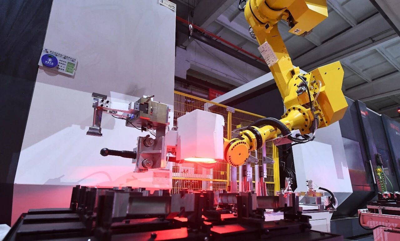 汽輪機公司中小葉片自動加工產(chǎn)線機械手臂正在裝卡葉片。