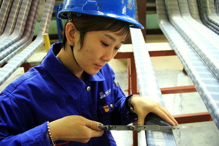 在電機(jī)公司線圈分廠有這樣一位人人稱頌的貼心好班長,她就是哈爾濱市五一巾幗標(biāo)兵、哈電集團(tuán)優(yōu)秀共產(chǎn)黨員、電機(jī)公司巾幗十佳標(biāo)兵,水電定子絕緣班班長徐鑫。身材單薄瘦弱的她,在工作中,卻總是不甘示弱,對待每一項(xiàng)工作都精益求精,掌握一手精湛的操作技能。在白鶴灘定子線棒生產(chǎn)技術(shù)準(zhǔn)備過程中,她積極踐行集團(tuán)公司“提質(zhì)增效黨員先行”黨建載體工程要求,以公司黨內(nèi)主題實(shí)踐活動(dòng)為載體,帶領(lǐng)班組黨員刻苦鉆研創(chuàng)新,設(shè)計(jì)制作了專用裝置,并在真機(jī)試驗(yàn)線棒生產(chǎn)中應(yīng)用,為白鶴灘定子線棒質(zhì)量提升,打造精品工程奠定了堅(jiān)實(shí)的基礎(chǔ)。對待班組同事,她更是賦予了超強(qiáng)的耐心,這也使得同事們之間關(guān)系和諧融洽,形成了“快樂工作、快樂生活”的良好工作氛圍。
