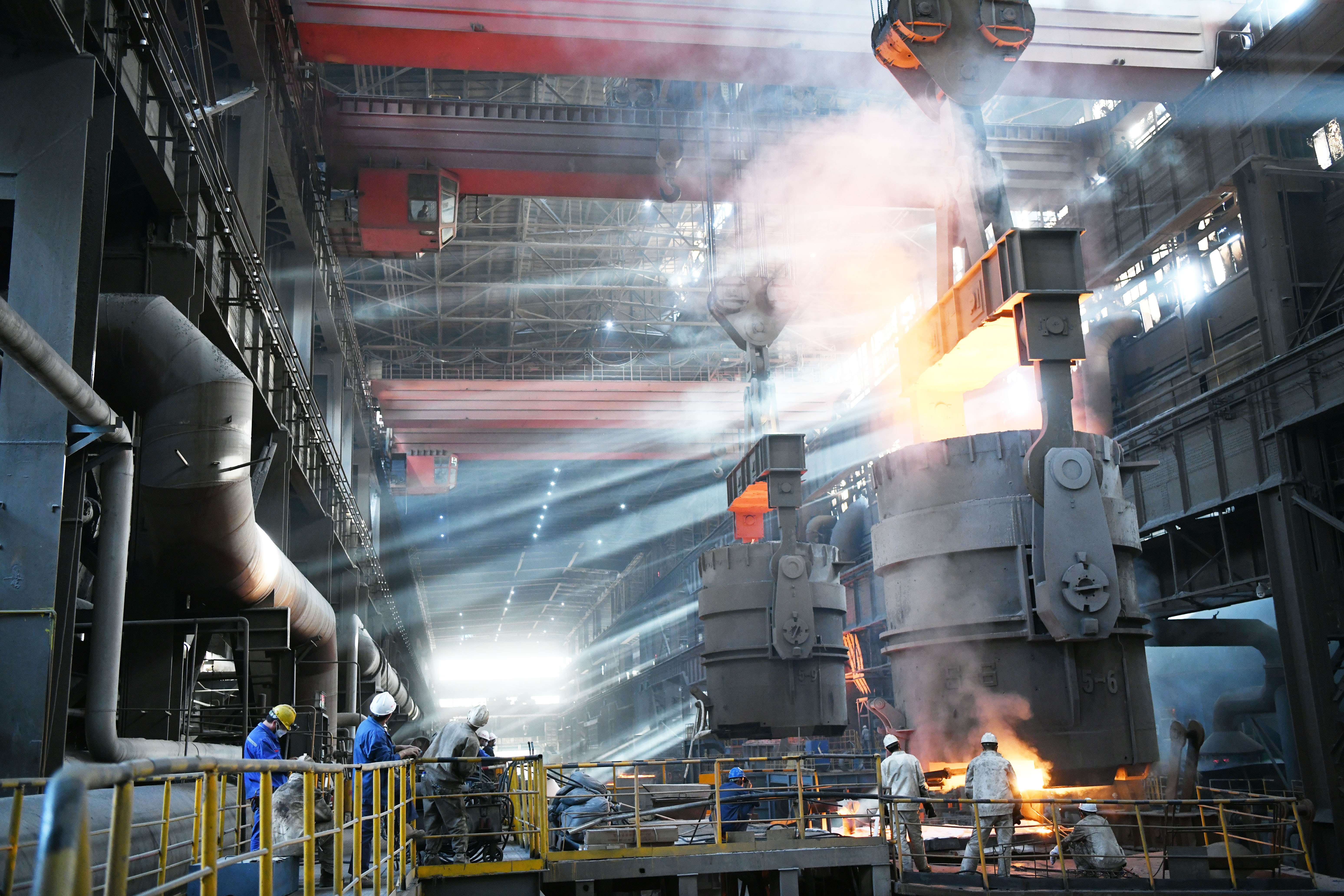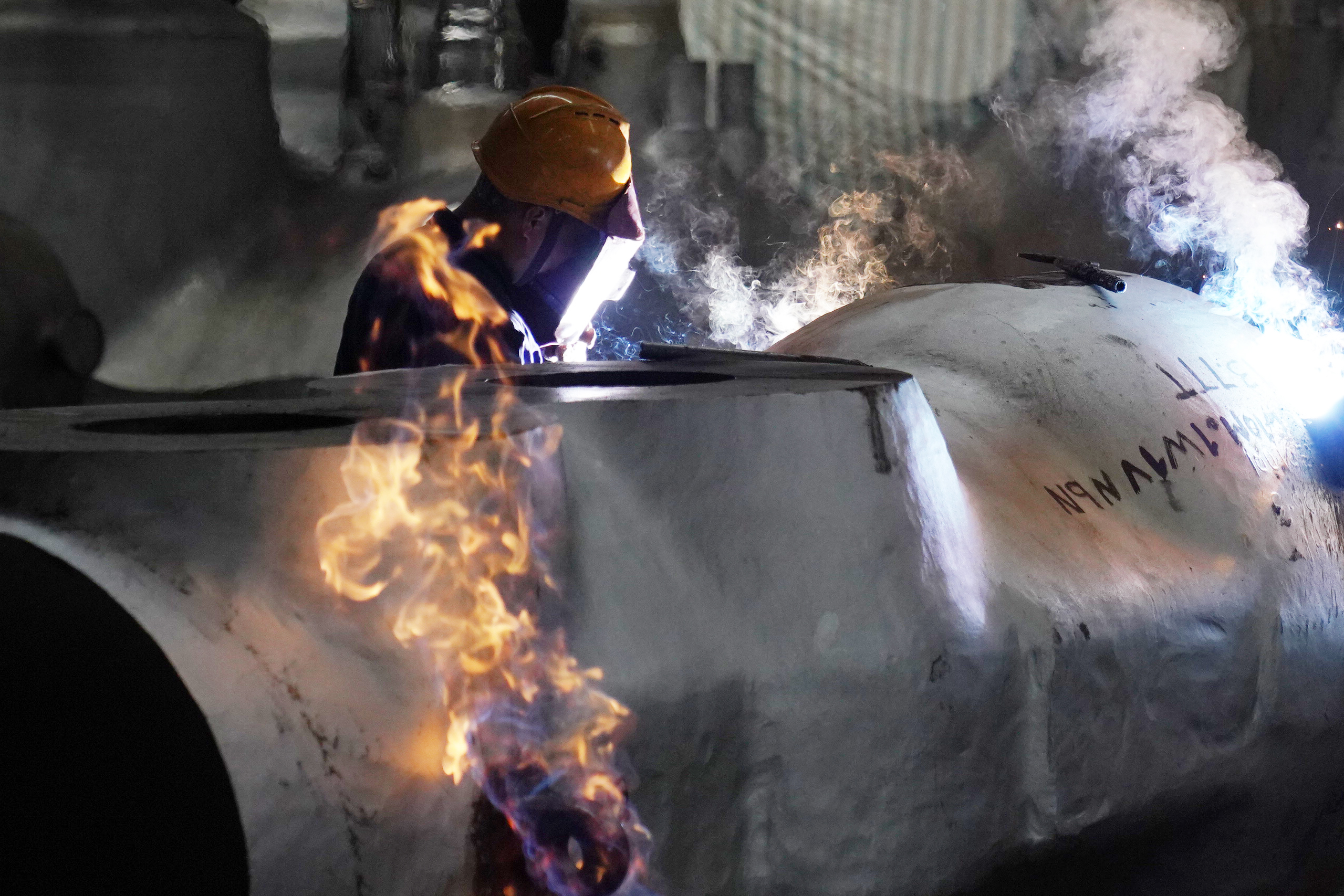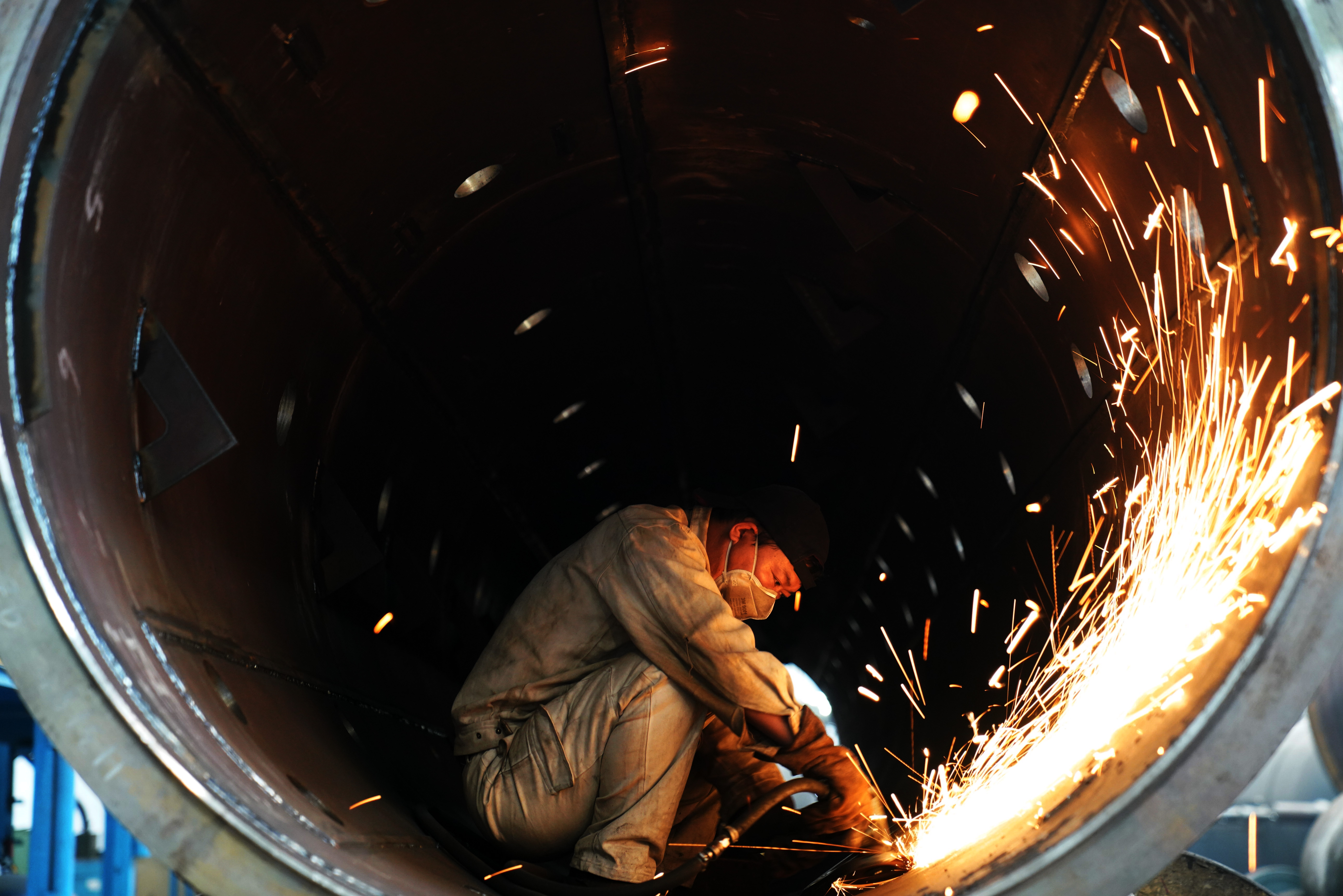 ↑在中國一重集團有限公司的廠房內(nèi),工人在進行生產(chǎn)作業(yè)(8月27日攝)。