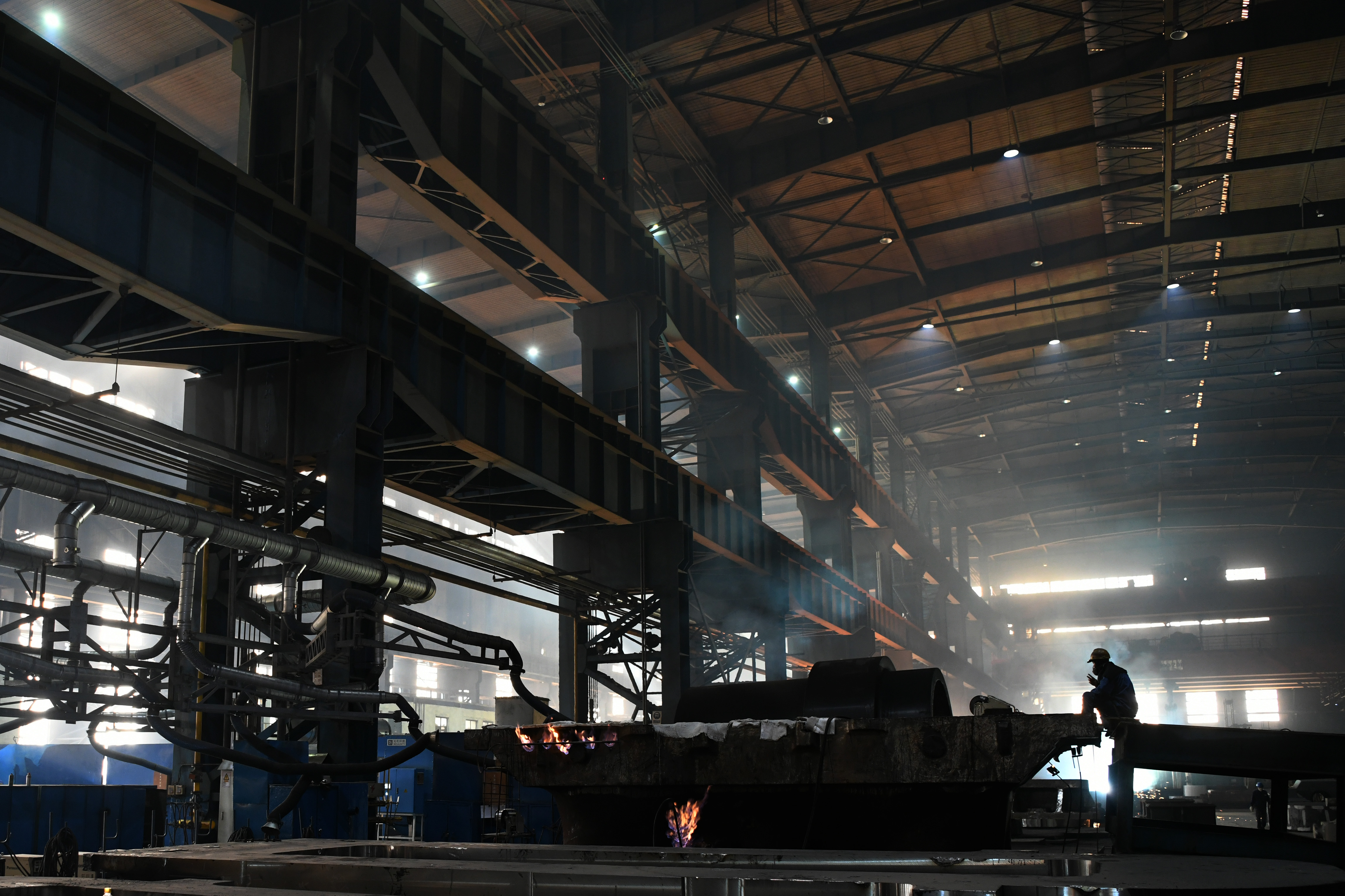 ↑在中國一重集團有限公司的廠房內(nèi),工人在進行生產(chǎn)作業(yè)(8月29日攝)。
