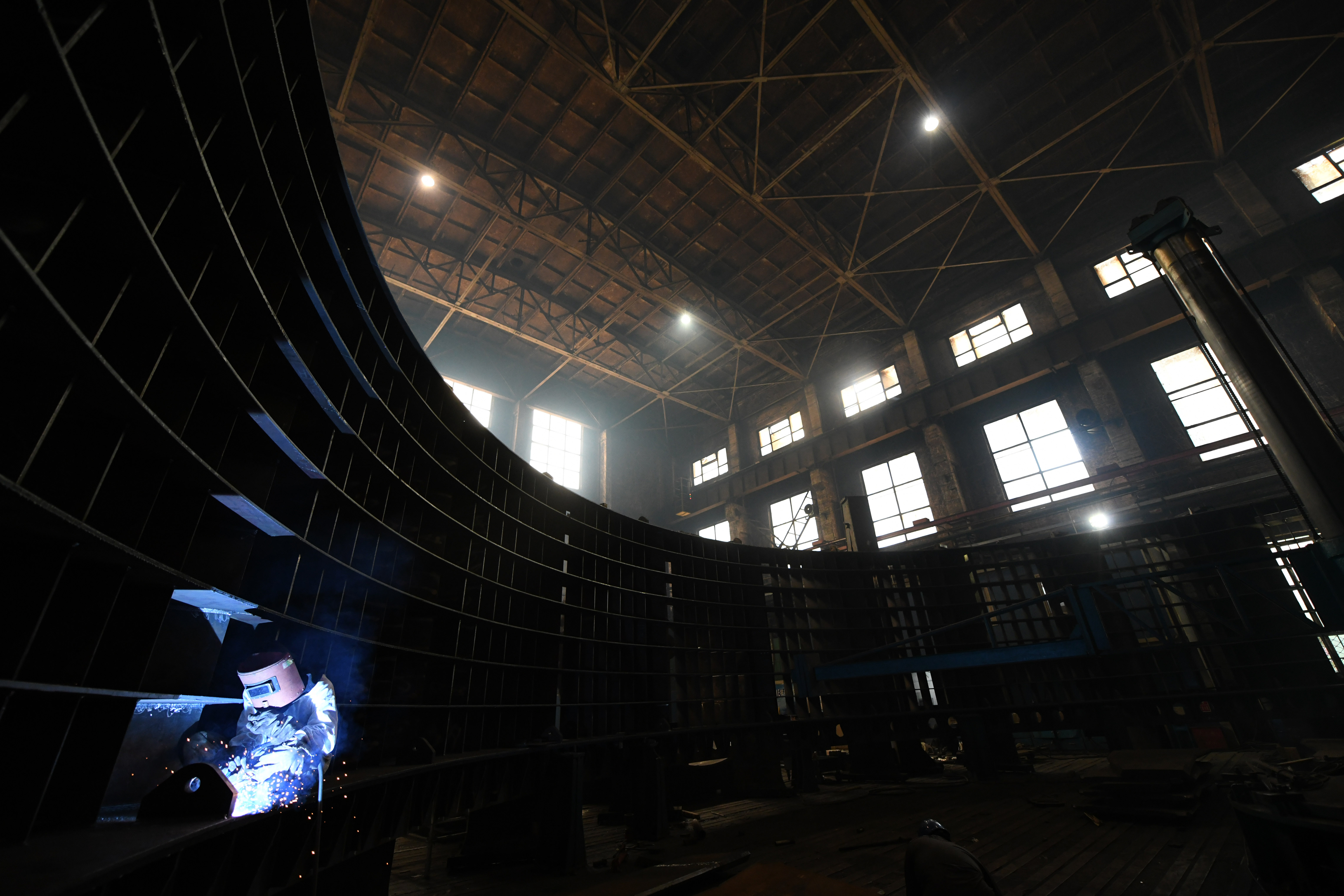 ↑在哈電集團哈爾濱鍋爐廠有限責任公司廠房內(nèi),工人在進行生產(chǎn)作業(yè)(9月4日攝)。